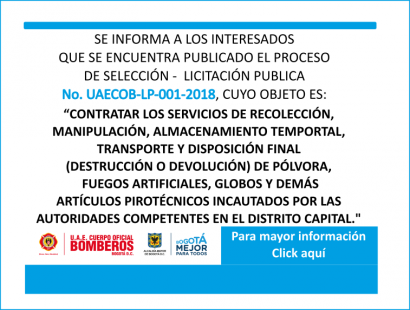 “CONTRATAR LOS SERVICIOS DE RECOLECCIÓN, MANIPULACIÓN, ALMACENAMIENTO TEMPORTAL, TRANSPORTE Y DISPOSICIÓN FINAL (DESTRUCCIÓN O DEVOLUCIÓN) DE PÓLVORA, FUEGOS ARTIFICIALES, GLOBOS Y DEMÁS ARTÍCULOS PIROTÉCNICOS INCAUTADOS POR LAS AUTORIDADES COMPETENTES EN EL DISTRITO CAPITAL."