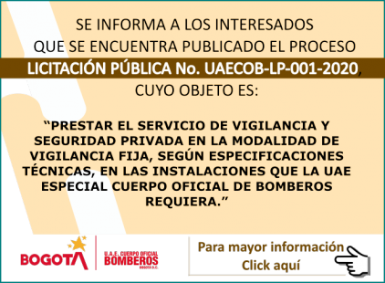 OBJETO: “PRESTAR EL SERVICIO DE VIGILANCIA Y SEGURIDAD PRIVADA EN LA MODALIDAD DE VIGILANCIA FIJA, SEGÚN ESPECIFICACIONES TÉCNICAS, EN LAS INSTALACIONES QUE LA UAE ESPECIAL CUERPO OFICIAL DE BOMBEROS REQUIERA.”