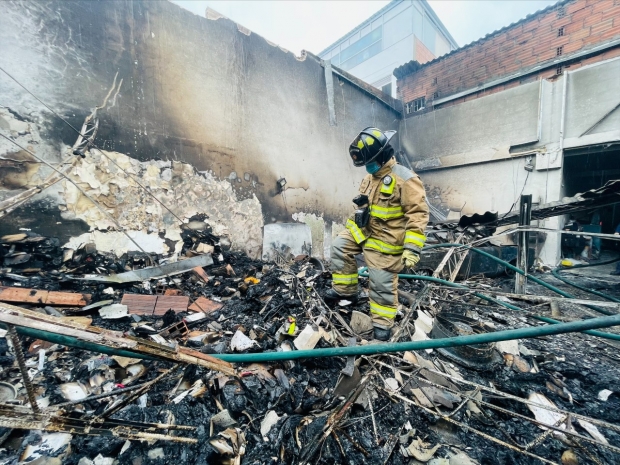 Bombero sobre las cenizas de una empresa