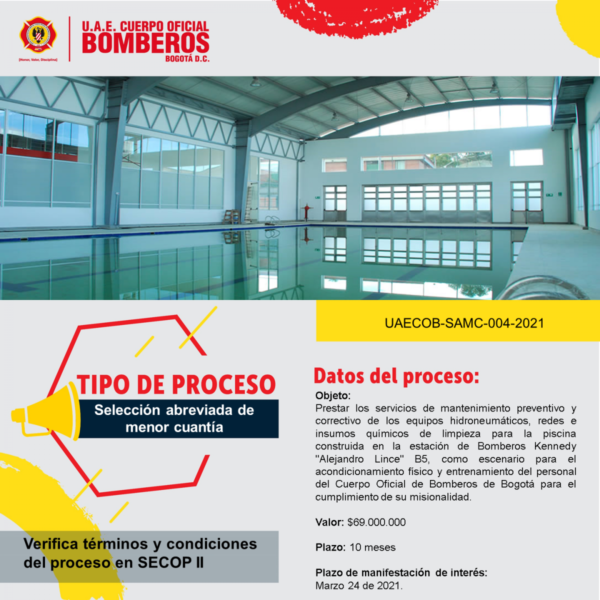 Abrimos convocatoria para proceso para "Prestar los servicios de mantenimiento preventivo y correctivo de los equipos hidroneumáticos, redes e insumos químicos de limpieza para la piscina construida en la estación de Bomberos Kennedy "